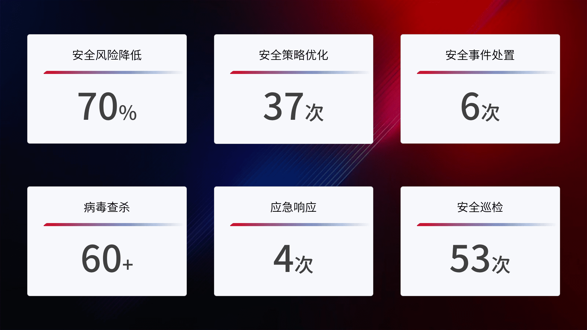 提供全面的安全事件报告体系,,,,包括处置报告、、周报、、季度和年度总结,,,结合持续监控,,,,帮助客户深入了解网络安全状况。。